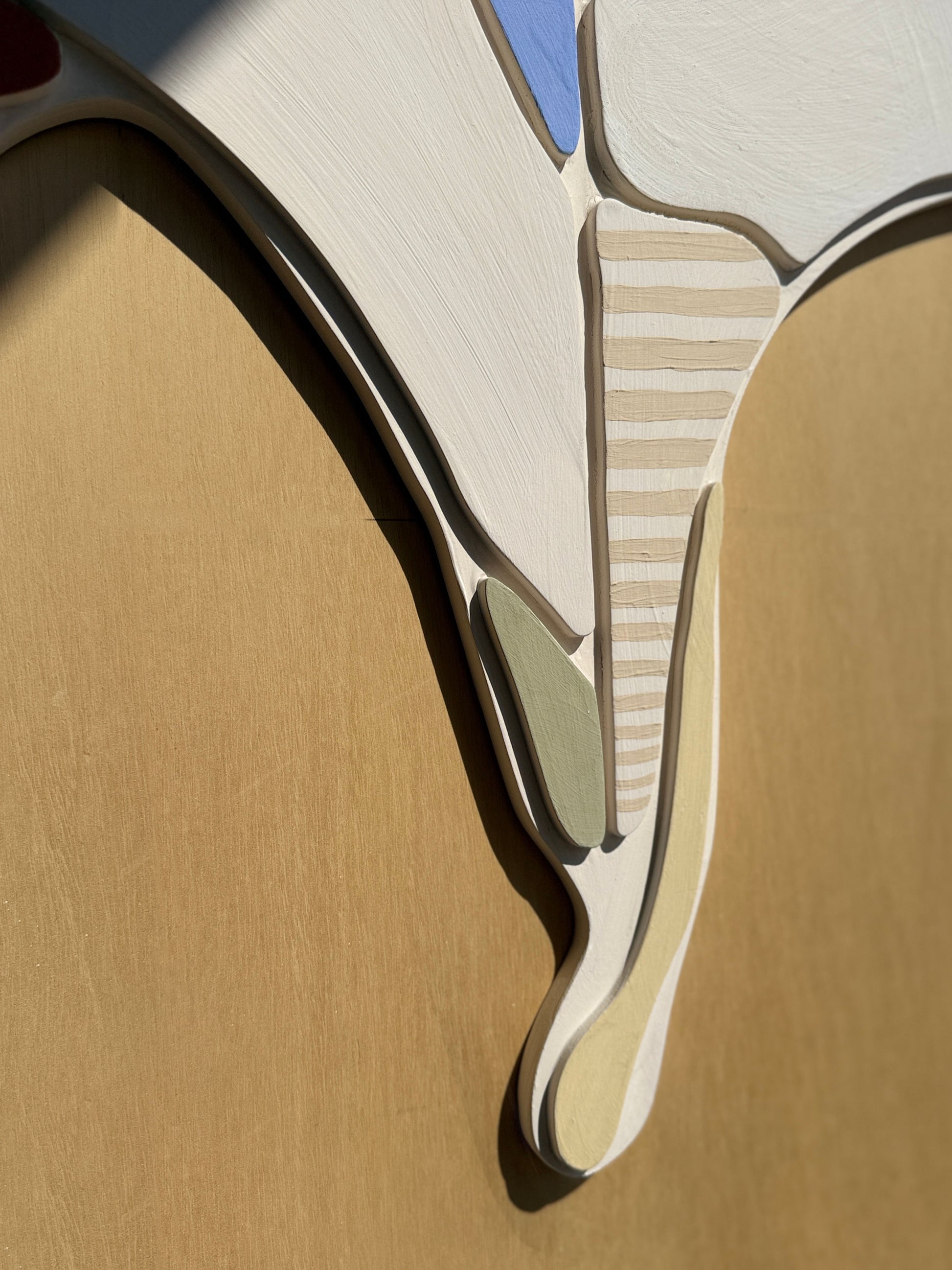 At the points where these arcs and curves intersect with the grid, the surfaces erupt in bursts of visual delight—tiny pockets of patterned reliefs, unexpected textural motifs, and pops of vibrant color. These moments of intersection feel celebratory, as though the rigid framework has been punctured to reveal joy beneath.