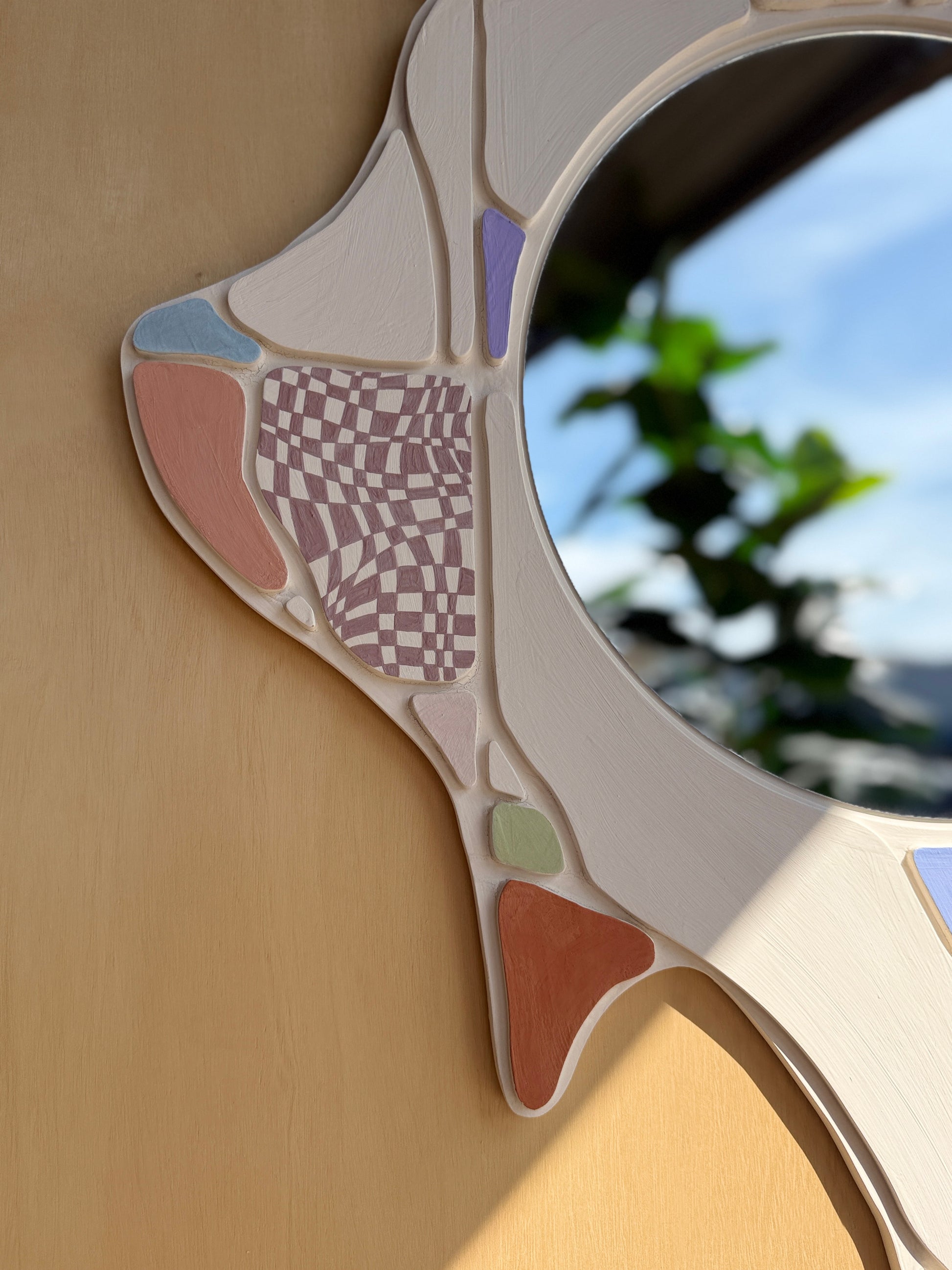 This Mirror is part of the “Libertad” collection of bas-reliefs marks a striking departure from the artist’s customary monochrome practice, embracing instead a spirit of colorful playfulness, sensuality, and release. Each piece appears to ripple with motion: wild, flowing curves carve their way across the surface, organic and unrestrained, like wind-tossed fabric or currents of water. These gestural forms overlay a barely perceptible grid, a quiet underlying structure that suggests order and restraint, only to be broken open by the exuberant lines above it.