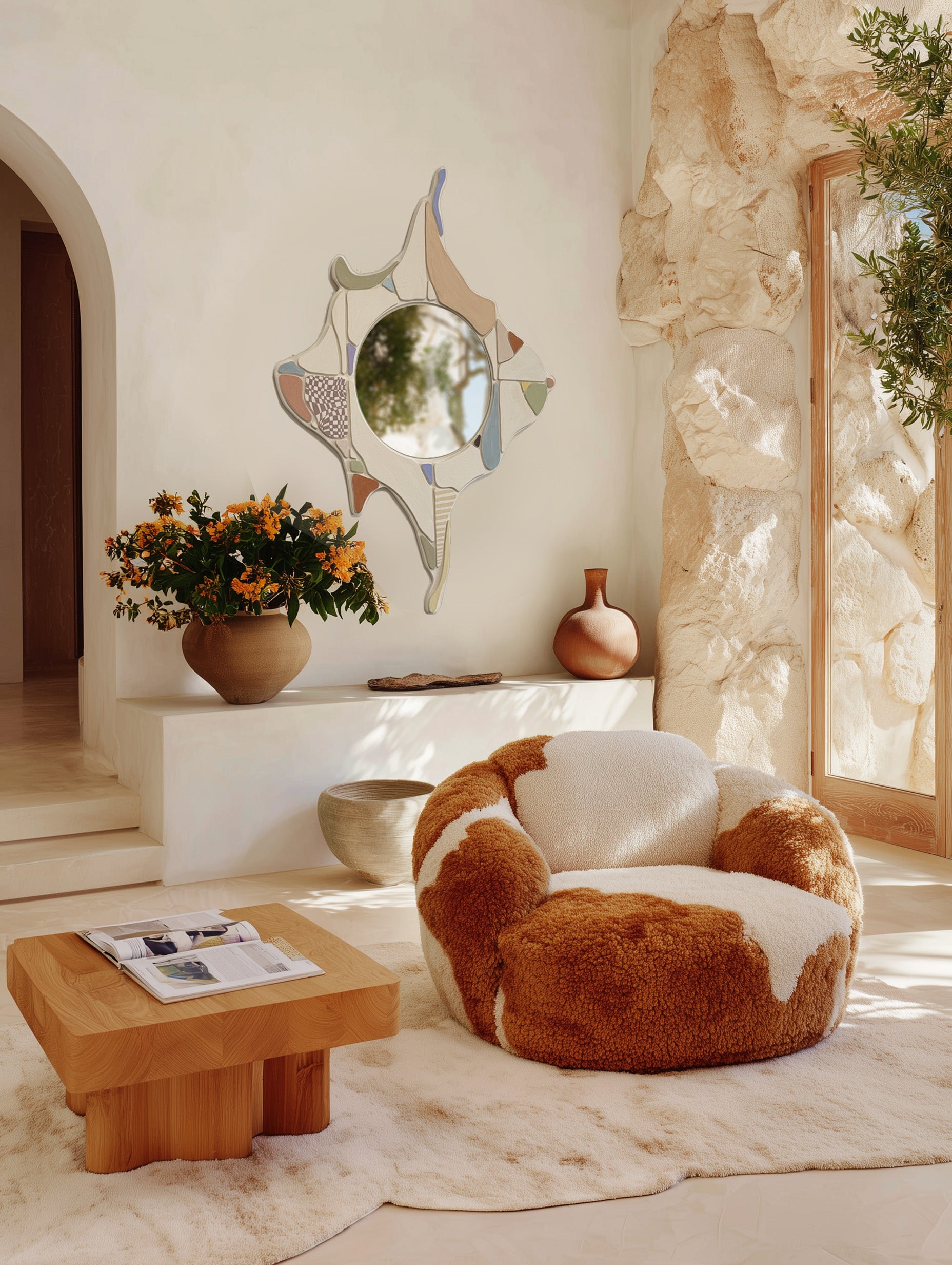“Melt” is a wood relief decorative mirror painted in lime wash. This is a playful abstraction of a melted diamond with fragmented pieces resembling cracks in concrete and rock formations.