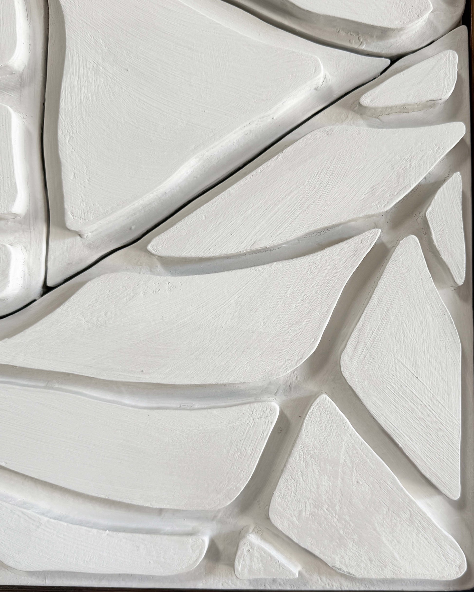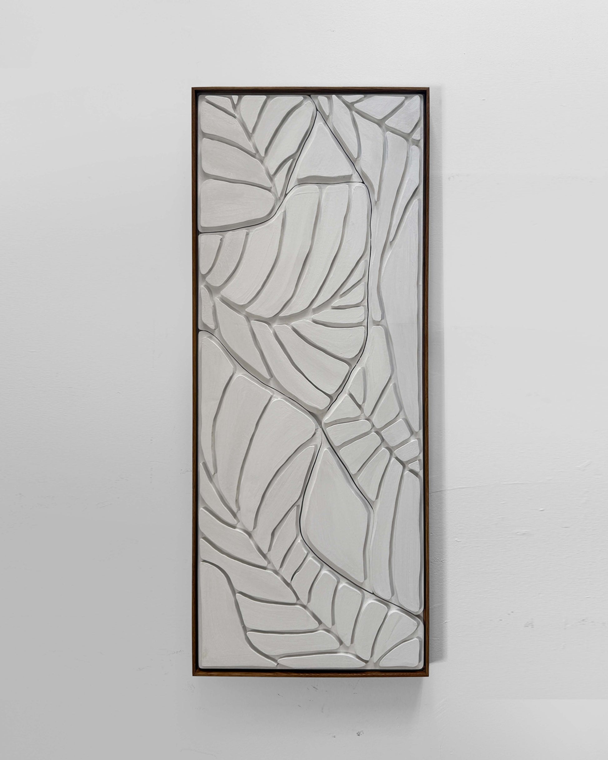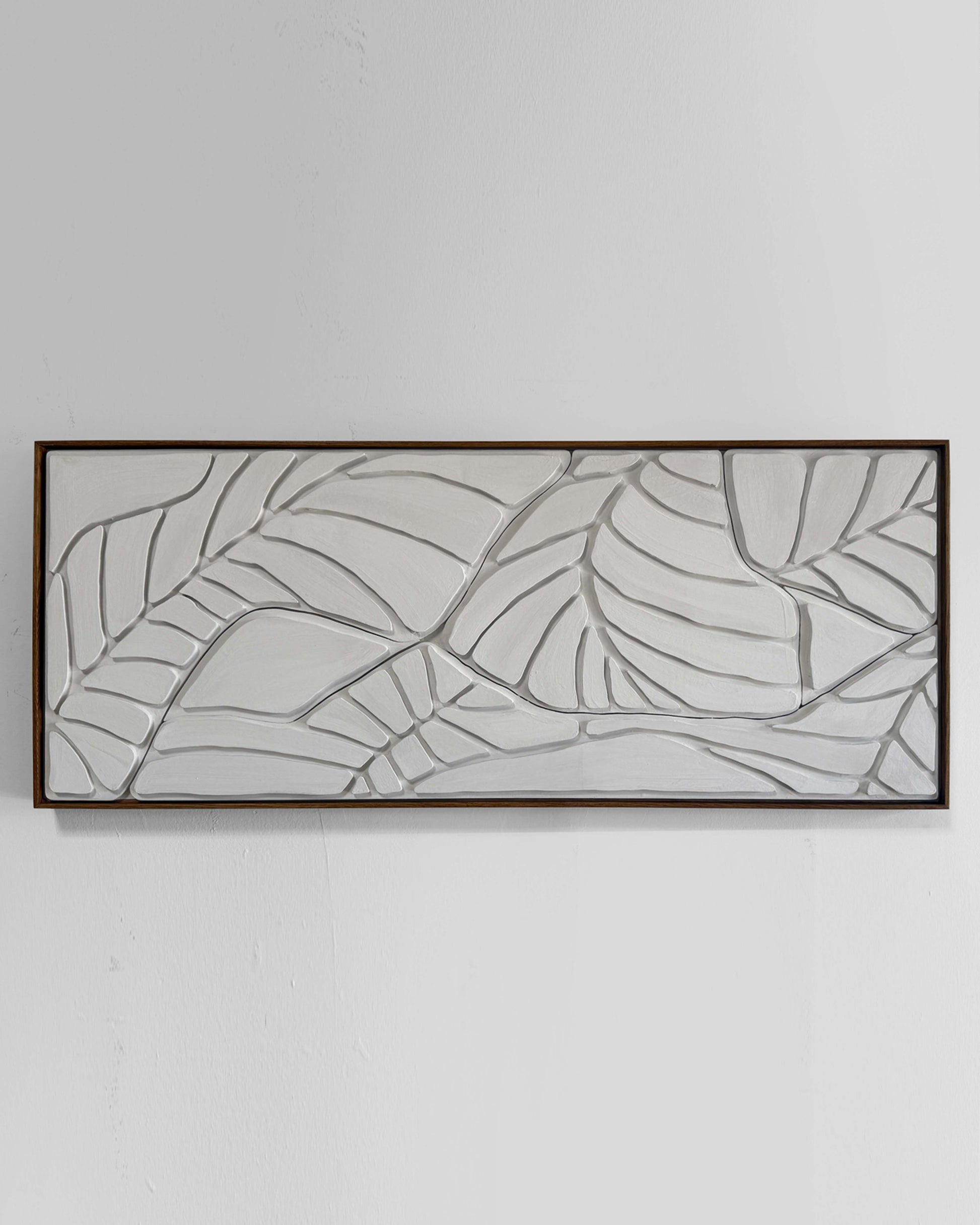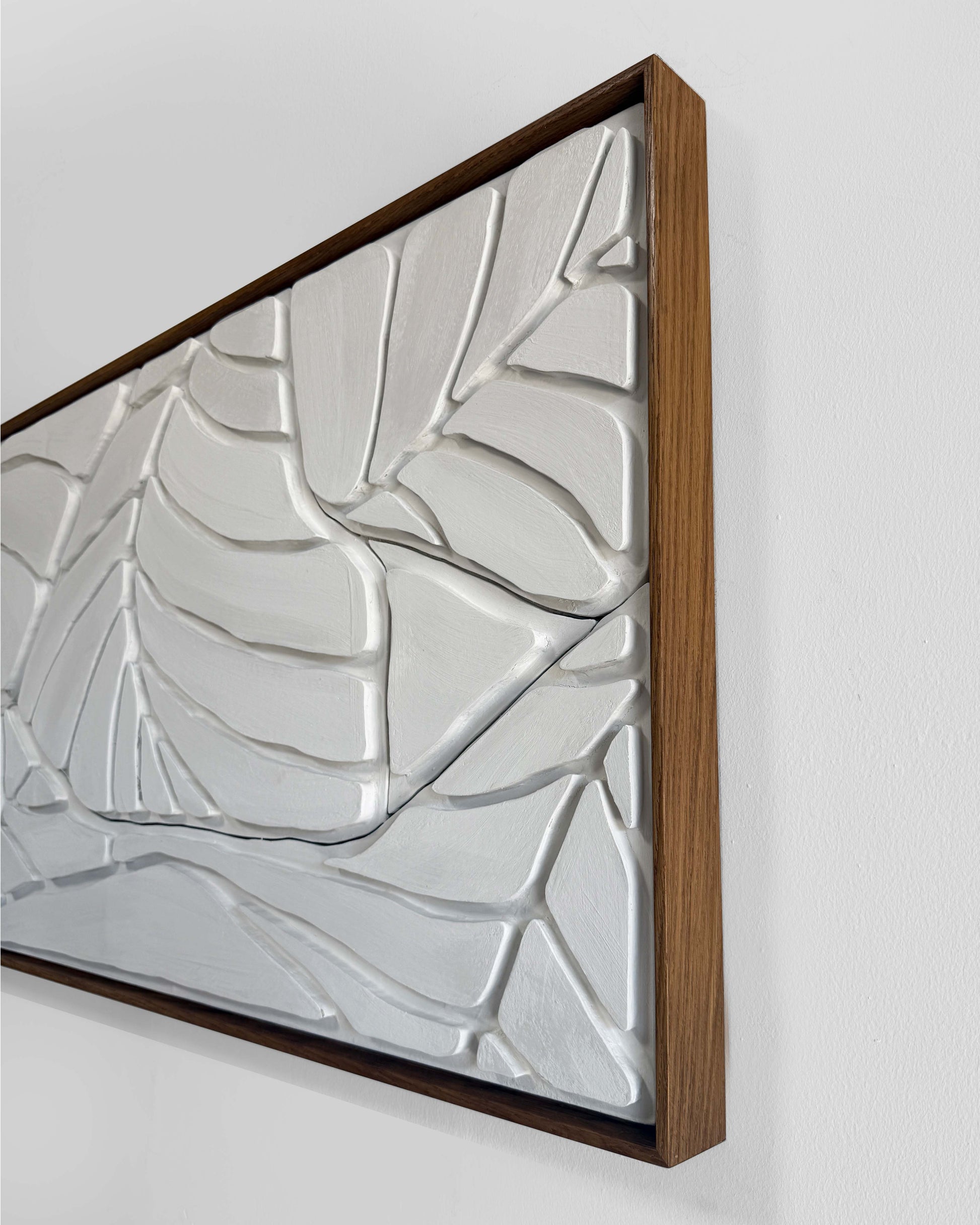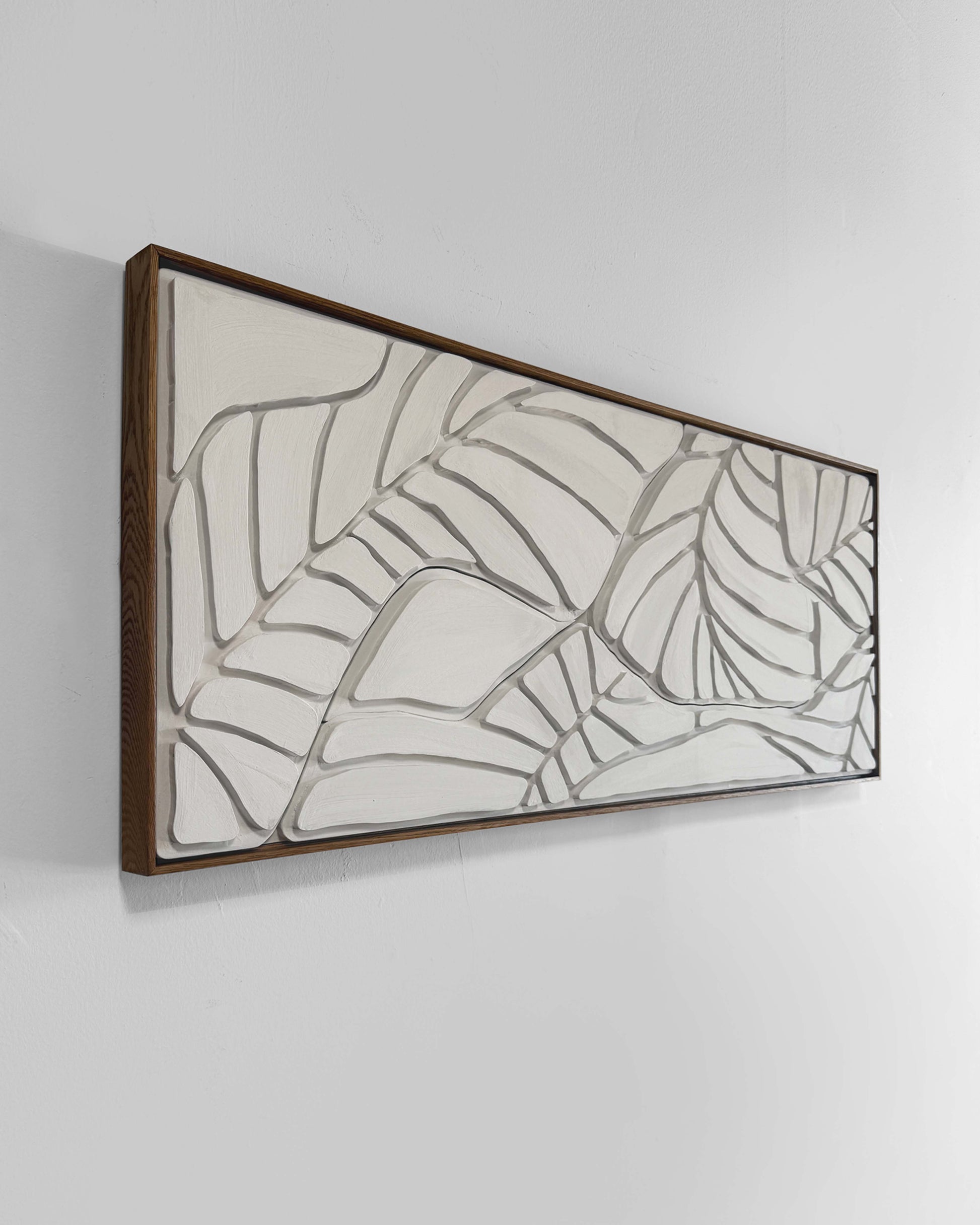 Selva 3 is a 60" x 24" mixed media bas relief on wood panel in a crisp linen white lime wash paint. It is framed in a white oak floater frame with a clear coat sealer. French cleat included for easy hanging.