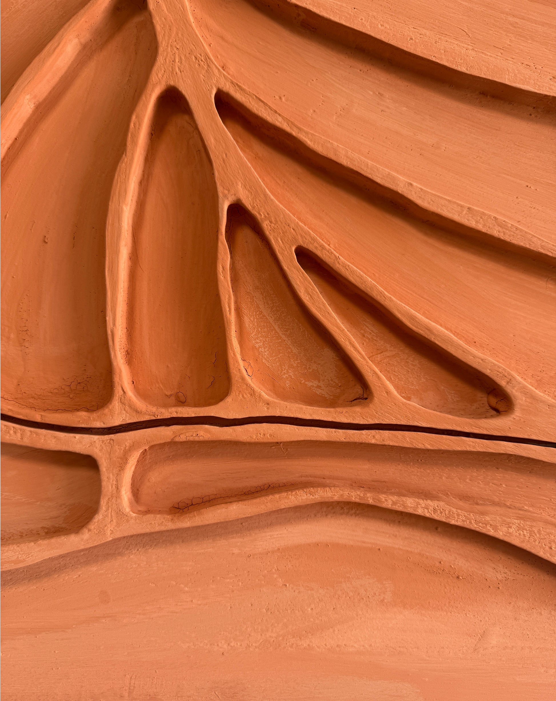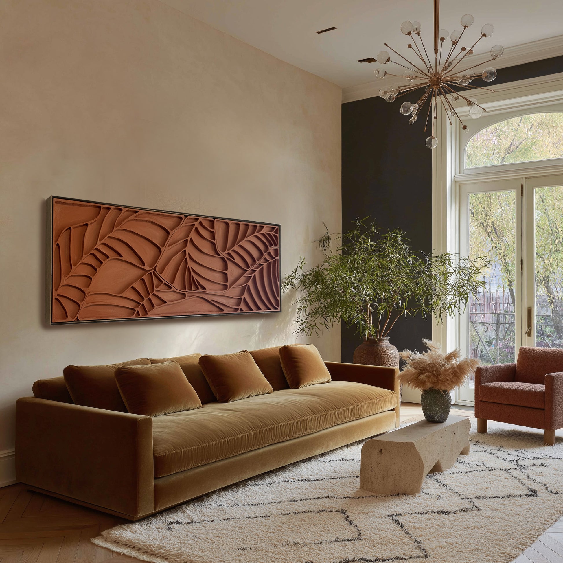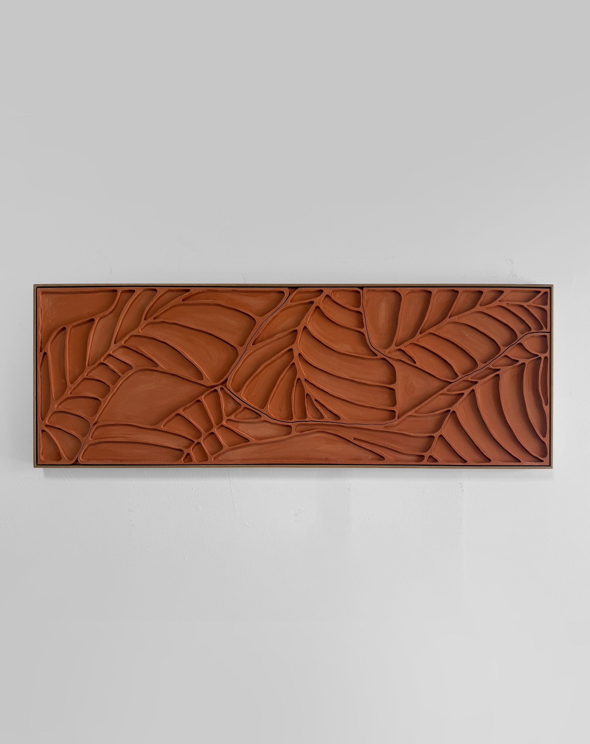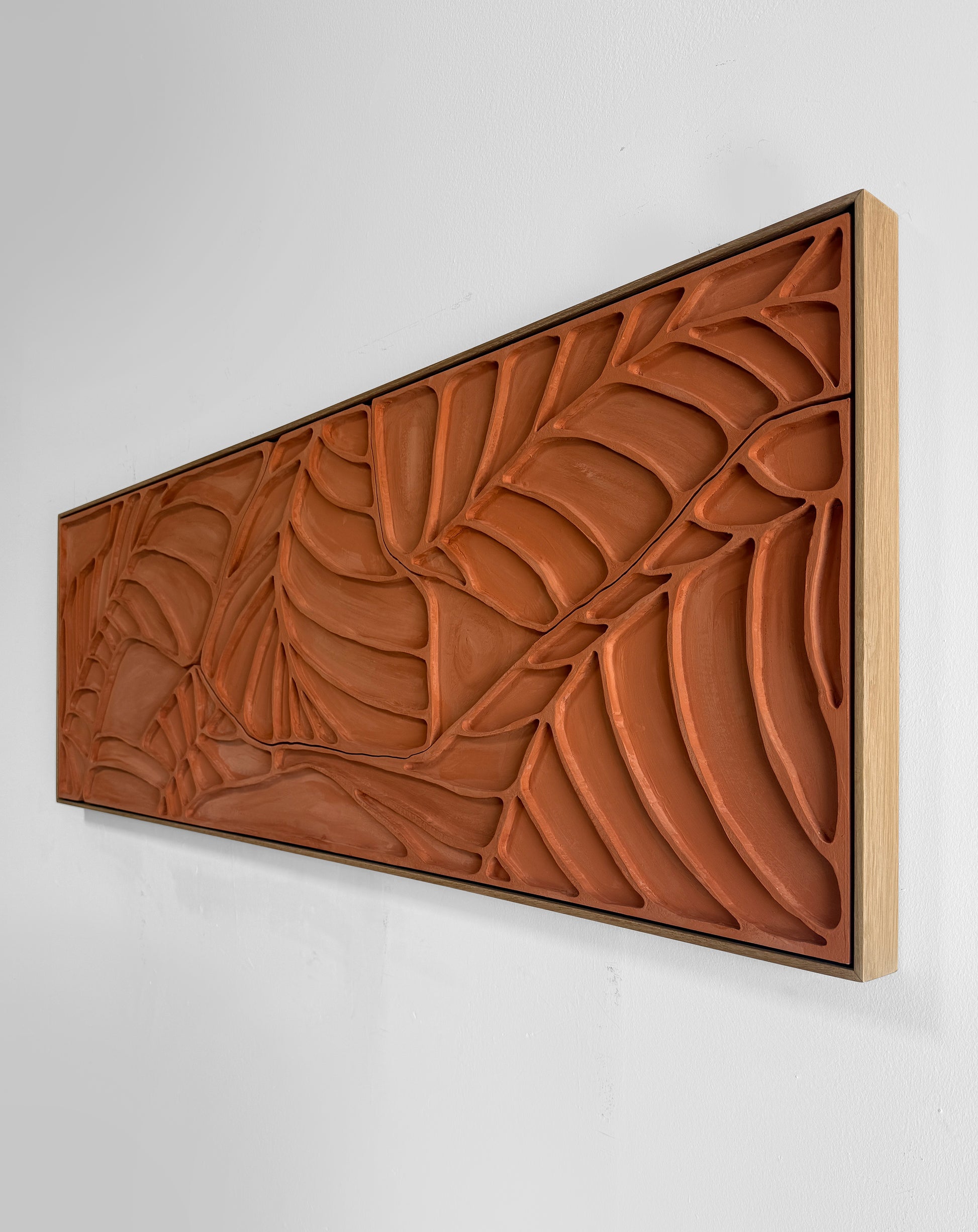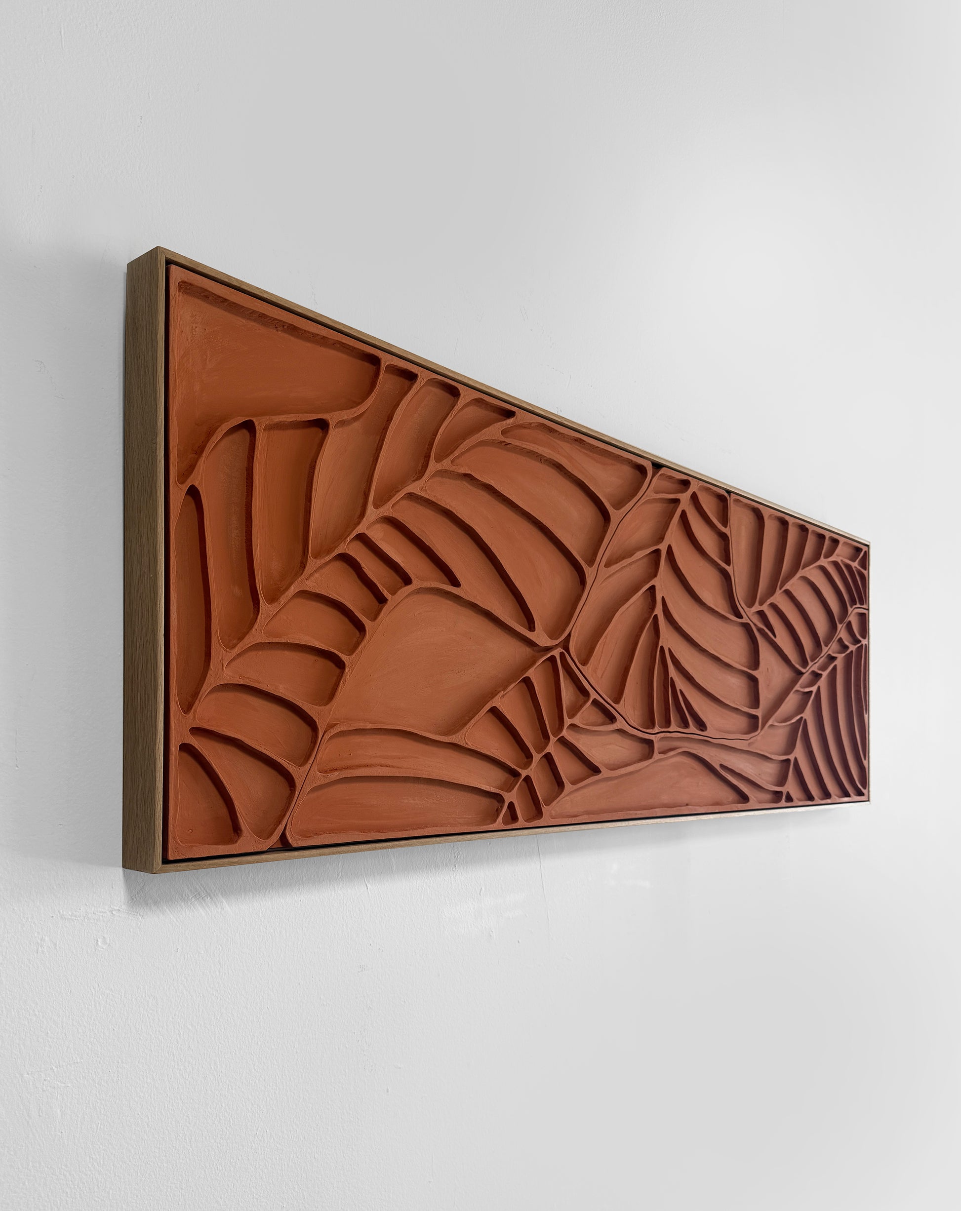 Selva 4 is a 72" x 24" mixed media bas relief on wood panel in a deep earthy terracotta lime wash paint. It is framed in a white oak floater frame. French cleat included for easy hanging.